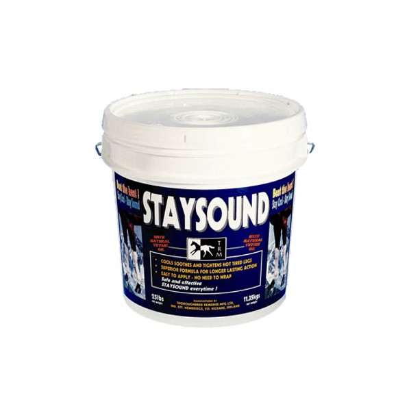 STAYSOUND é uma argila fria que arrefece, alivia e reafirma as patas cansadas. STAYSOUND está pronto para usar, é fácil de aplicar e tem uma duração longa, não há necessidade para embrulhar ou ligar as pernas, e é fácil de lavar.