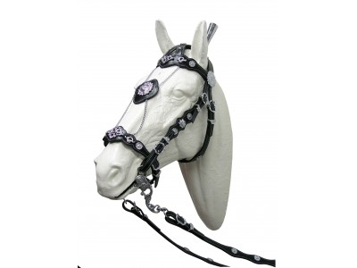 Cabeçada Portuguesa de Cortesia feita de couro com fivelas e enfeites decorativos em metal. Largura 20 milímetros de qualidade. Tem 1 par de rédeas.