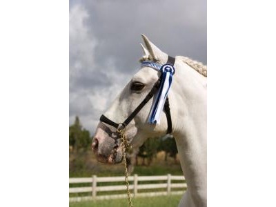 Cabeçada de apresentação em couro com testeira de cores.