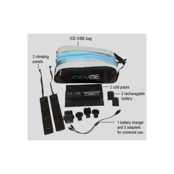Conteúdo da embalagem: 2 carregadores, 2 bolsas de gelo, 2 painéis de vibração, um carregador de bateria e 3 adaptadores para uso universal. Mais informações em www.ice-vibe.com