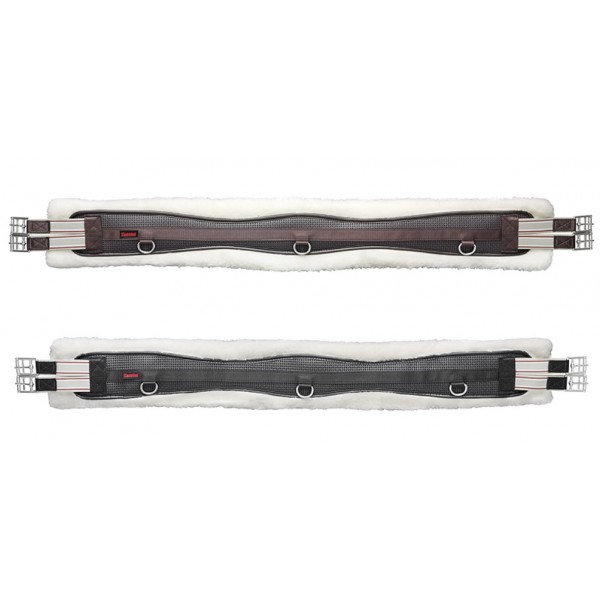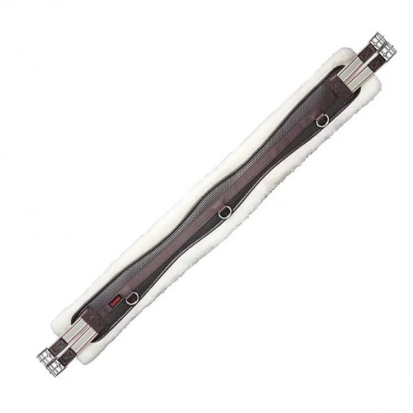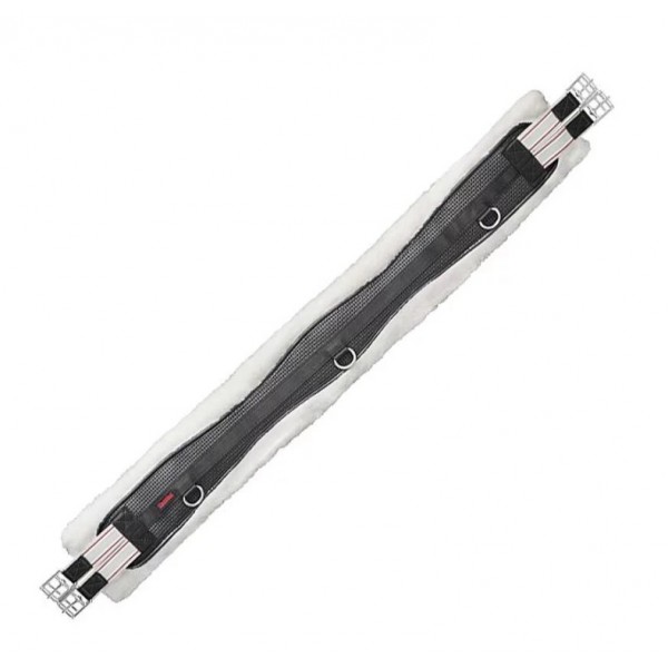 Em neoprene curvo, forrado com pele de ovelha sintética, com faixas elásticas contrastantes nos dois lados, anel em D no centro e nas duas semestralidades.