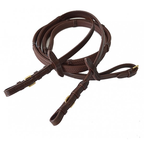 Neste caso, a borracha utilizada é um novo design com excelentes qualidades de aderência. As tachas costuradas à borracha das rédeas também são feitas de couro.