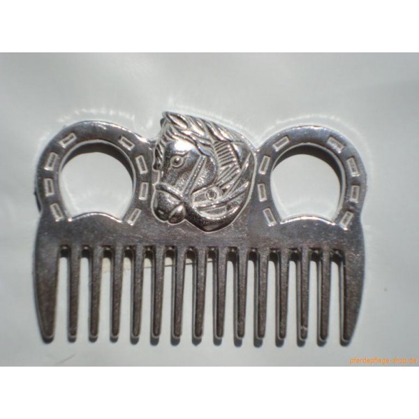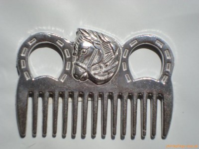Pente em alumínio com uma cabeça de cavalo desenhada no centro e duas ferraduras nas extremidades do pente que servem de pegas.