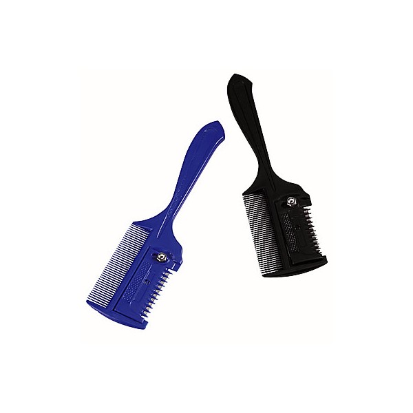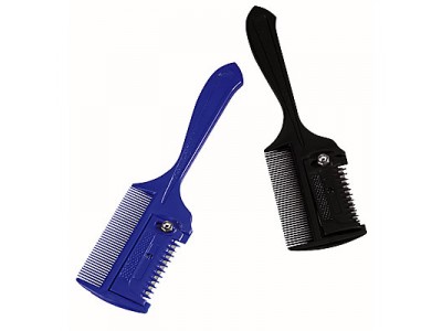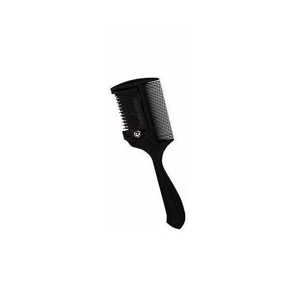 Pente de plástico com uma fila de dentes e uma razoável lámina removível com parafusos de segurança e com 18 centímetros de comprimento.