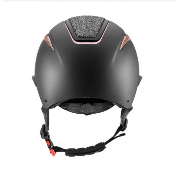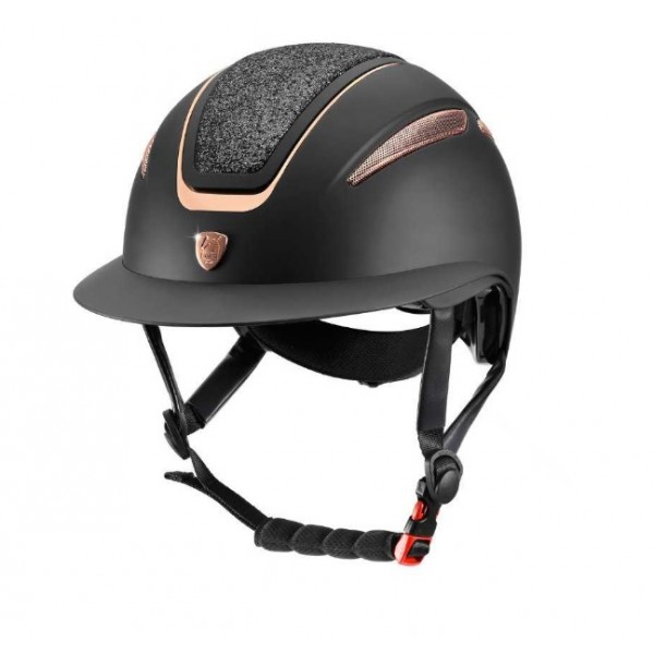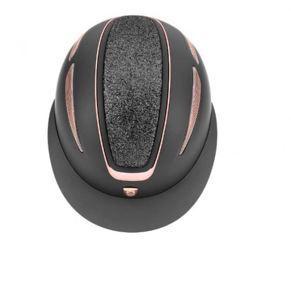 Acabamento em ouro rosa brilhante e nova placa com glitter. Aprovação CE VG1 e certificação TUV. Ajuste em velcro, viseira larga que envolve as laterais, grelhas de ventilação duplas laterais, forro amovível e lavável, ajuste micrométrico com roda.