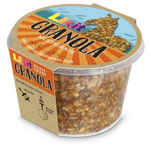 Divertida e saborosa, a pedra de lamber Likit Granola contém milho, aveia, trigo e cevada.