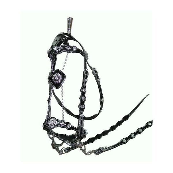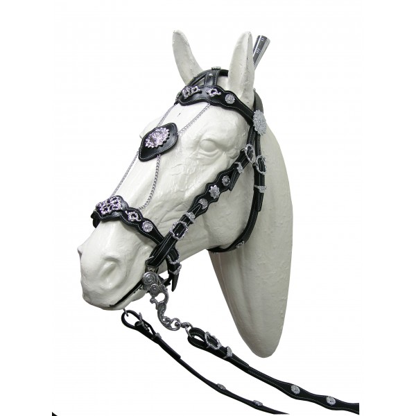 Cabeçada Portuguesa de Cortesia feita de couro com fivelas e enfeites decorativos em metal. Largura 20 milímetros de qualidade. Tem 1 par de rédeas.