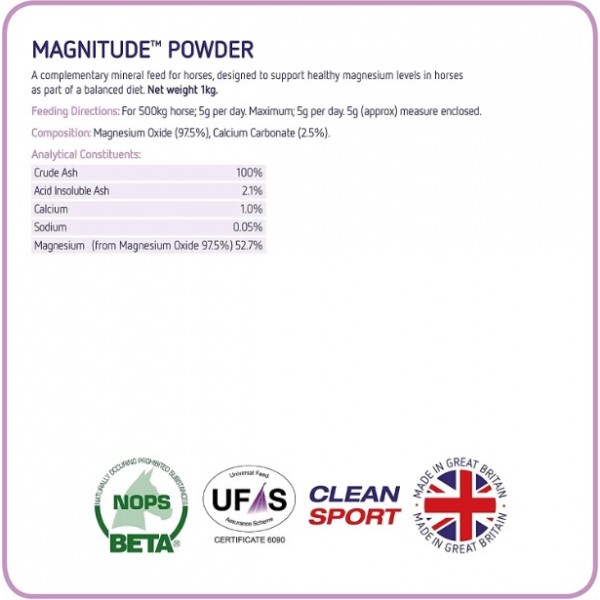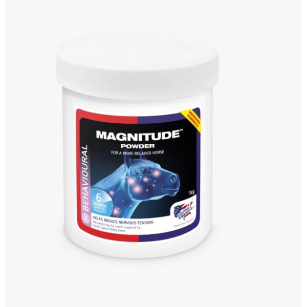 Magnitude fornece magnésio suplementar, juntamente com quantidades controladas de cálcio (outro mineral chave no metabolismo nervoso e muscular), para ajudar a promover a função nervosa saudável e reduzir a tensão, permitindo que o cavalo se concentre e se concentre.